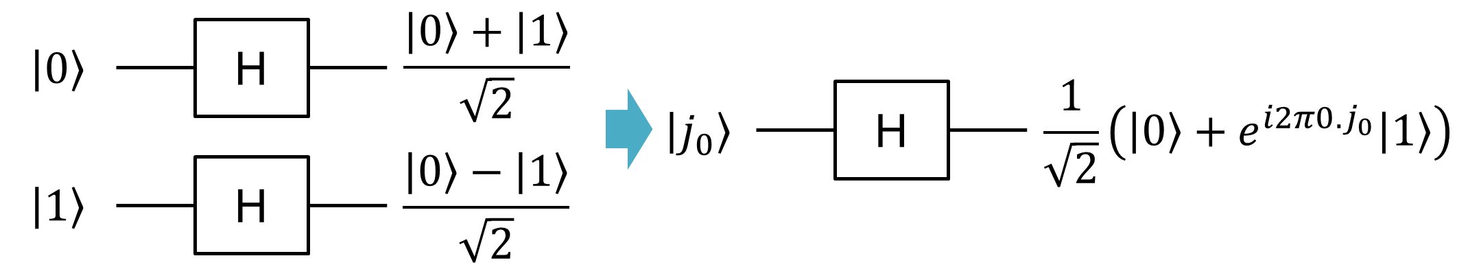 \[\ket{j_0} \xrightarrow{QFT} \frac{1}{\sqrt{2}}(\ket{0}+e^{i2\pi 0.j_{0}}\ket{1})\]