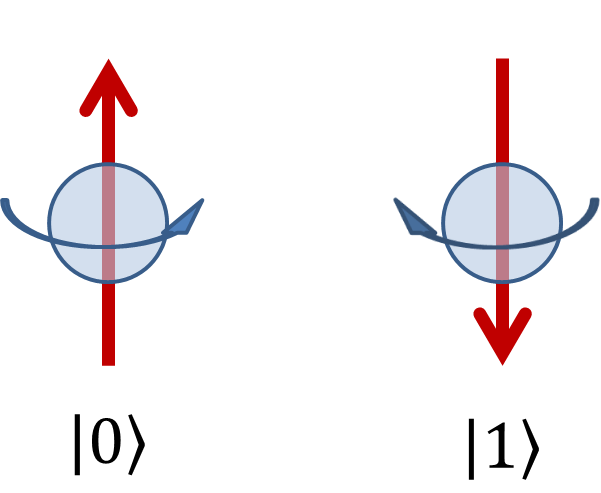 さて、スピンには上向きと下向きがあると言いました。ある方向、例えばこれをz方向として、上向きの状態のことを\(\ket{0}\)、下向きの状態のことを\(\ket{1}\)と書くことにしてみましょう。\(\ket{}\)という記号はケットという記号で、量子力学的な状態を表すのに表すときに使う記号です。例えば\(\ket{1}\)はケット1のように読みます。この\(\ket{0},\ket{1}\)の2つの状態で表されるスピンが、量子コンピュータにおいて古典コンピュータでのbitに相当する