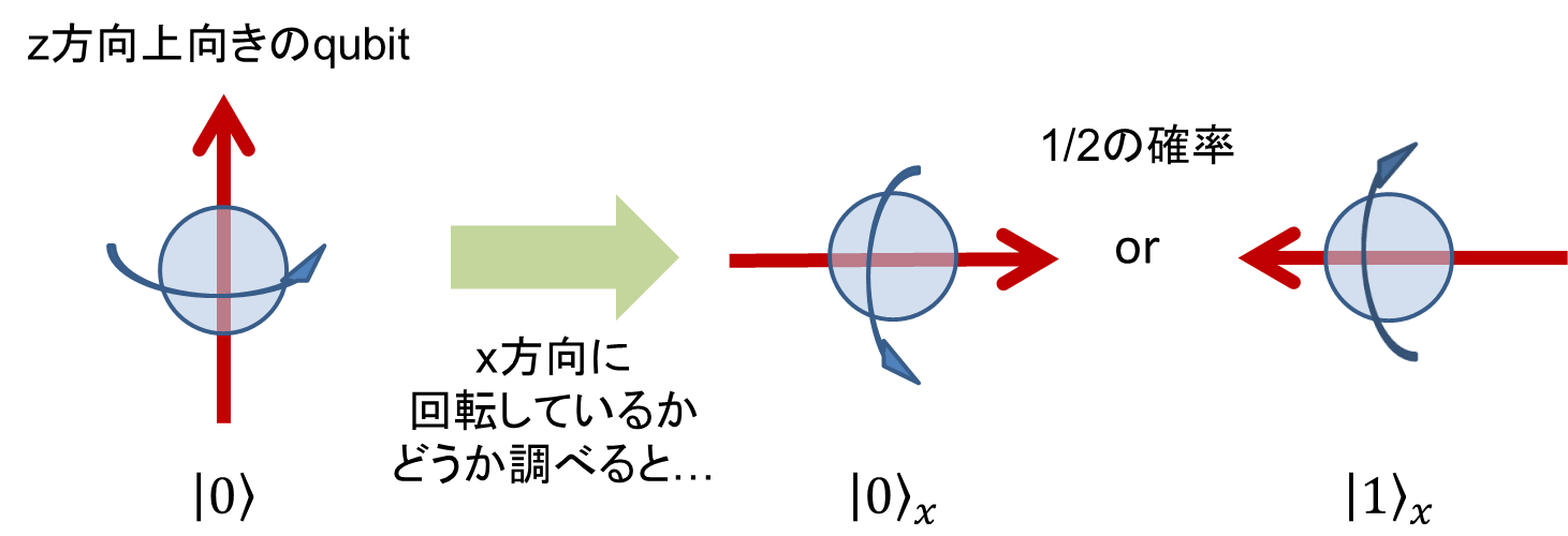 例えば、z方向上向きの状態\(\ket{0}\)にいる1つのスピンを取り上げて、それと直交するx方向にどれだけ回転しているかということを測定してみます。スピンが普通の自転ならば、この状況でx方向の回転があるわけが無いですね。だってz方向に回転しているものを測定するわけですから。しかし、スピンのような量子力学的なものを考えるときには、そのような考え方が通用しません。z方向上向きの状態にいるqubit\(\ket{0}\)がx方向にどれだけ回転しているかという「測定」をすると、ちょうど\(1/2\)の確率で、x方向に対してそれぞれ上向き・下向きに回転している、という結果となります。