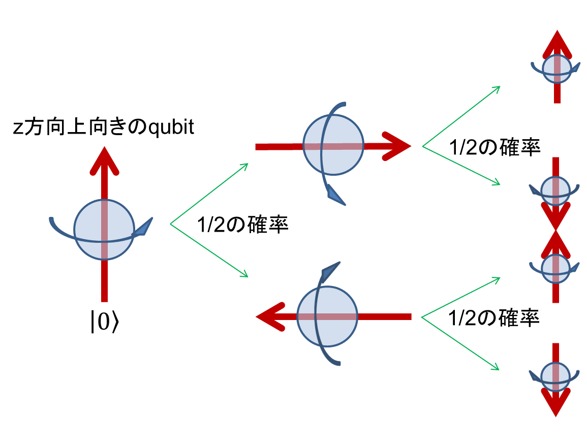 する、と言ったりします。) つまり、\(\ket{0}\)というのは1つの状態であるわけでは無くて、実は\(\ket{+},\ket{-}\)が重ね合わさった状態だったというわけです。この\(\ket{+},\ket{-}\)の重ね合わせ状態を観測したときの振る舞いを考えてみます。x方向とz方向の観測について法則が違っていては困ってしまいますから、当然