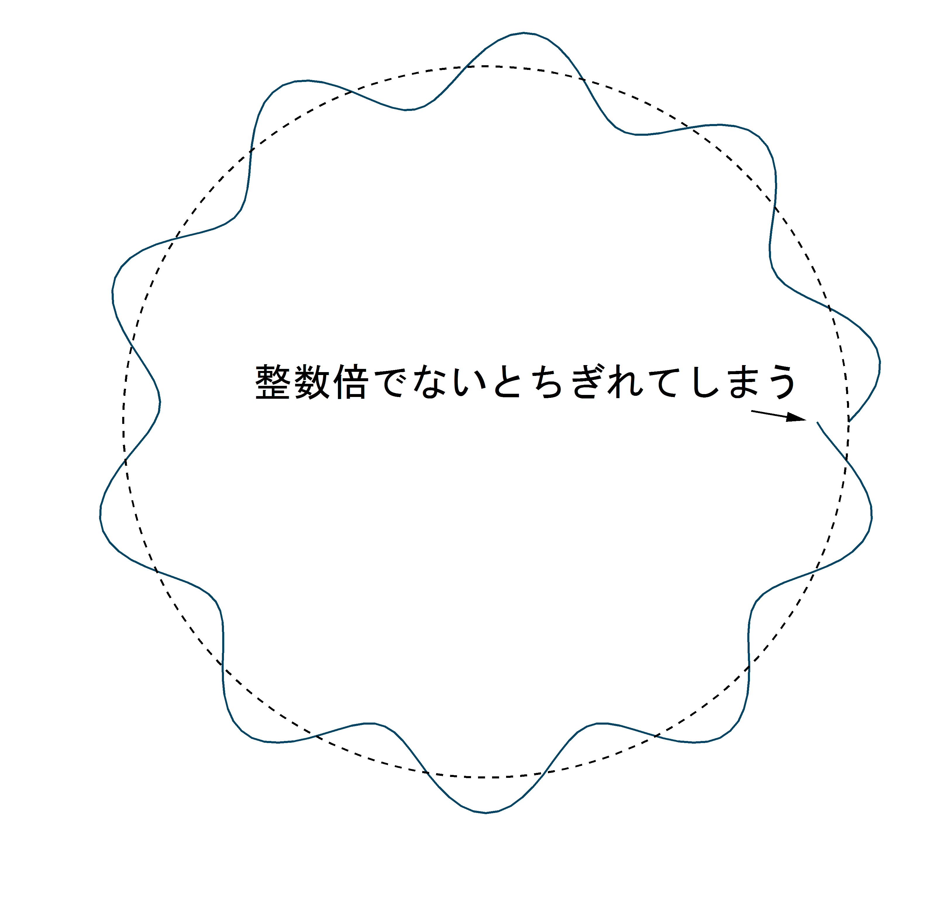 となる。一方で、電子を波として捉えるなら、下の図のように、軌道の周長は波長の整数倍になっているはずだ。