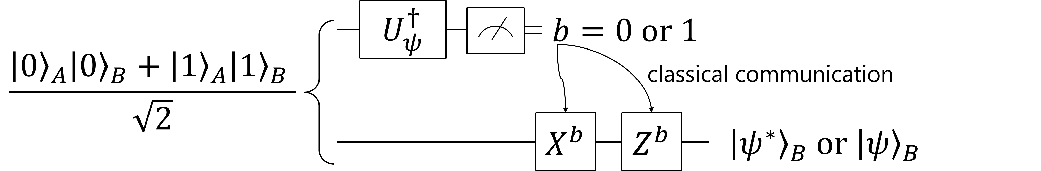 - 最大エンタングル状態の片割れが \(\ket{\psi^*}\) に射影されたことで、B さん側に \(\ket{\psi}\) が現れる。