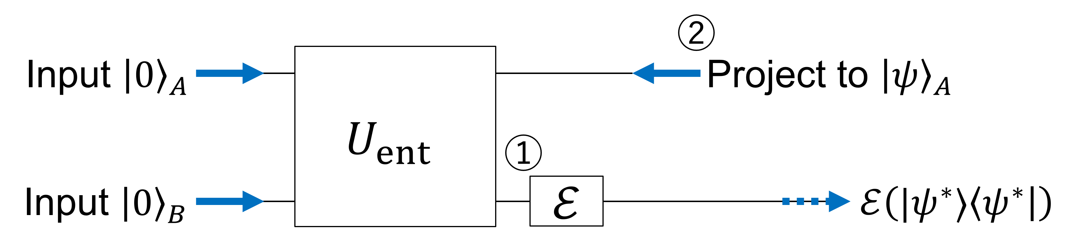 ここで、A 側を \(\ket{\psi}\) へと射影することによって B 側に現れた \(\ket{\psi^*}\) に量子チャネル \(\mathcal{E}\) を作用させることを考えよう。(