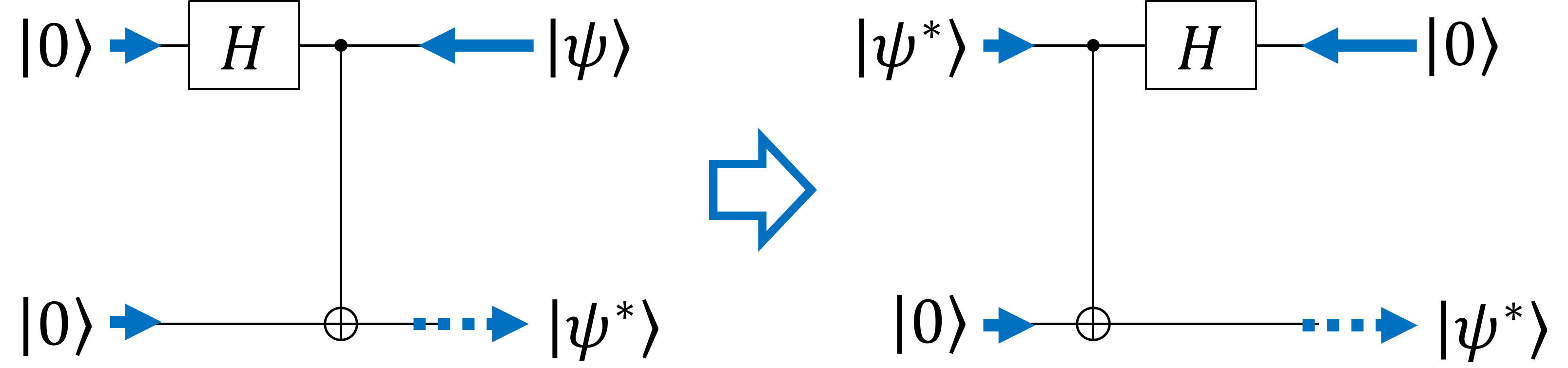 が、確率的にしかできないのは、状態 \(\ket{\psi}\) の入力を射影測定に頼っているからである。そこで、A 側だけを左右反転した下のような回路によれば、決定論的なテレポーテーションが可能になるかもしれない。