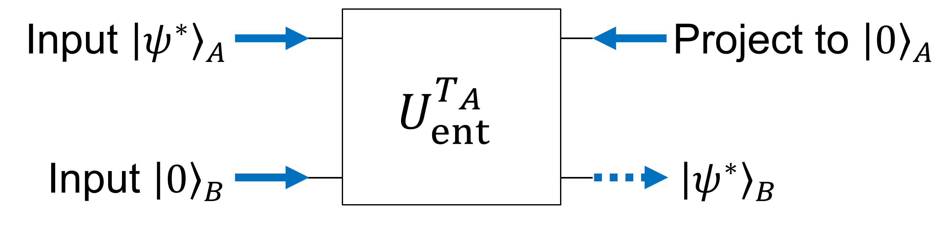 (\(T_A\) は A 側だけの転置を表す。) 左右反転したので入力が \(\ket{\psi^*}_A\) と複素共役になり、\(U_{\mathcal{ent}}\) は A 側だけの転置となるだろうという直感のもと、回路を書いてみた。