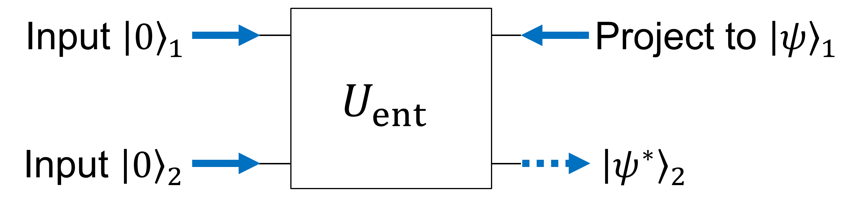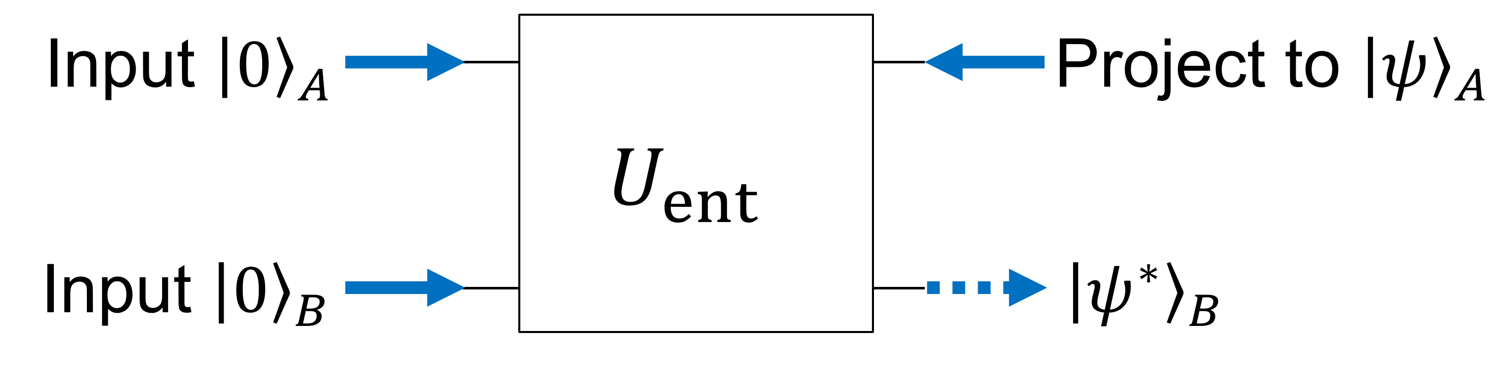 とする。\(\ket{\Psi_{AB}}\) の A 系を \(\ket{\psi}_A = \sum_i \psi_i \ket{a_i}\) へと射影すると、B 系は \(\sum_i \psi^*_i \ket{b_i} := \ket{\psi^*}_B\) へと射影される。すなわち