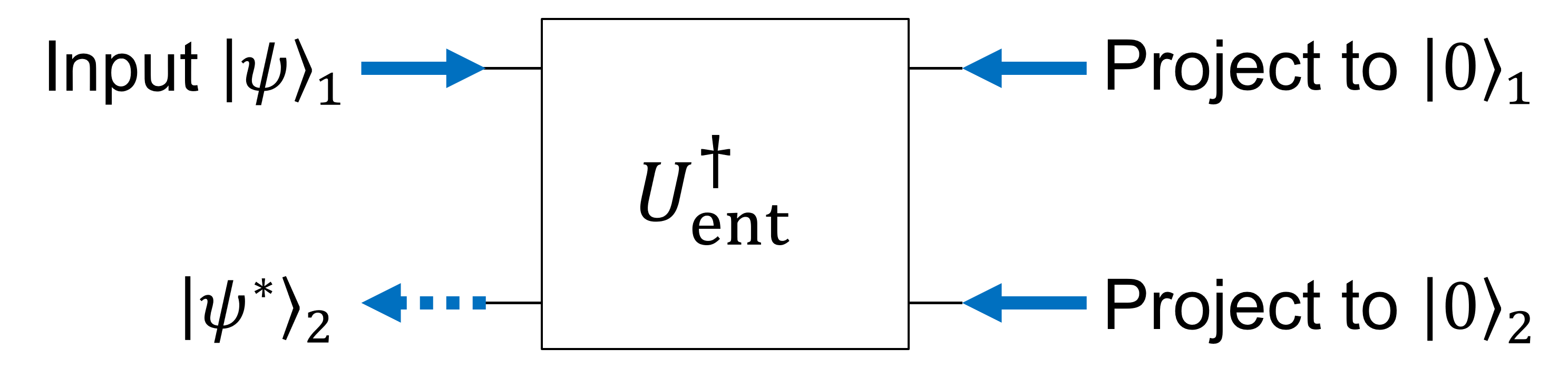さて、この \(U_\psi\) を使って \(\ket{\psi}\) への射影を行うには、まず逆変換 \(U^\dagger_\psi\) を \(\ket{\Psi}_{AB}\) のA側に作用させたあとに \(\ket{0}, \ket{1}\) 基底で測定すればよい。このとき測定結果 \(\ket{0},\ket{1}\) によってそれぞれ