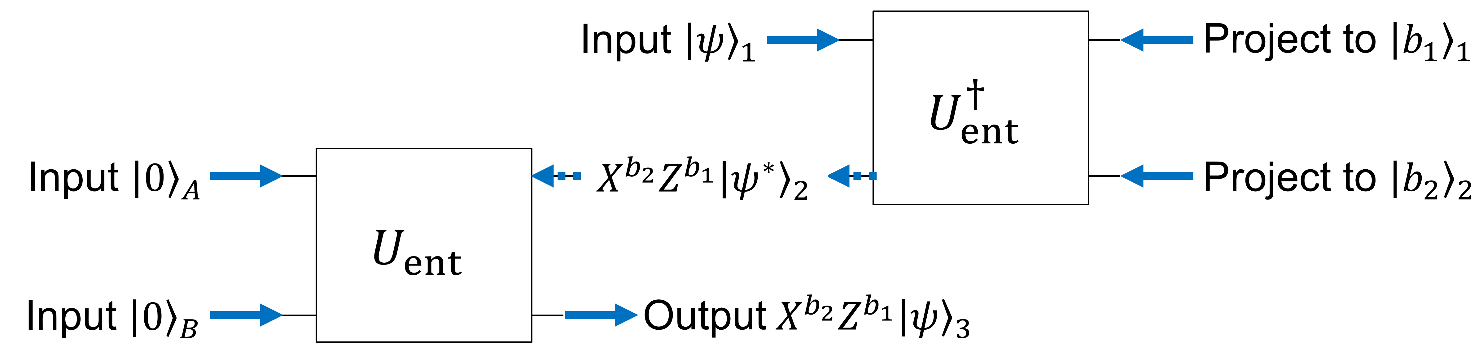 となって、正しいことがわかる。最後の測定で \(\ket{1}\) に射影されてしまったときには、エンタングルメントのリソース状態として、\(\ket{00}+\ket{11}\) の代わりに \(\ket{00}-\ket{11}\) を使ったことに相当するので、B 側に \(Z\) ゲートをかけて基底を戻してやればよい。