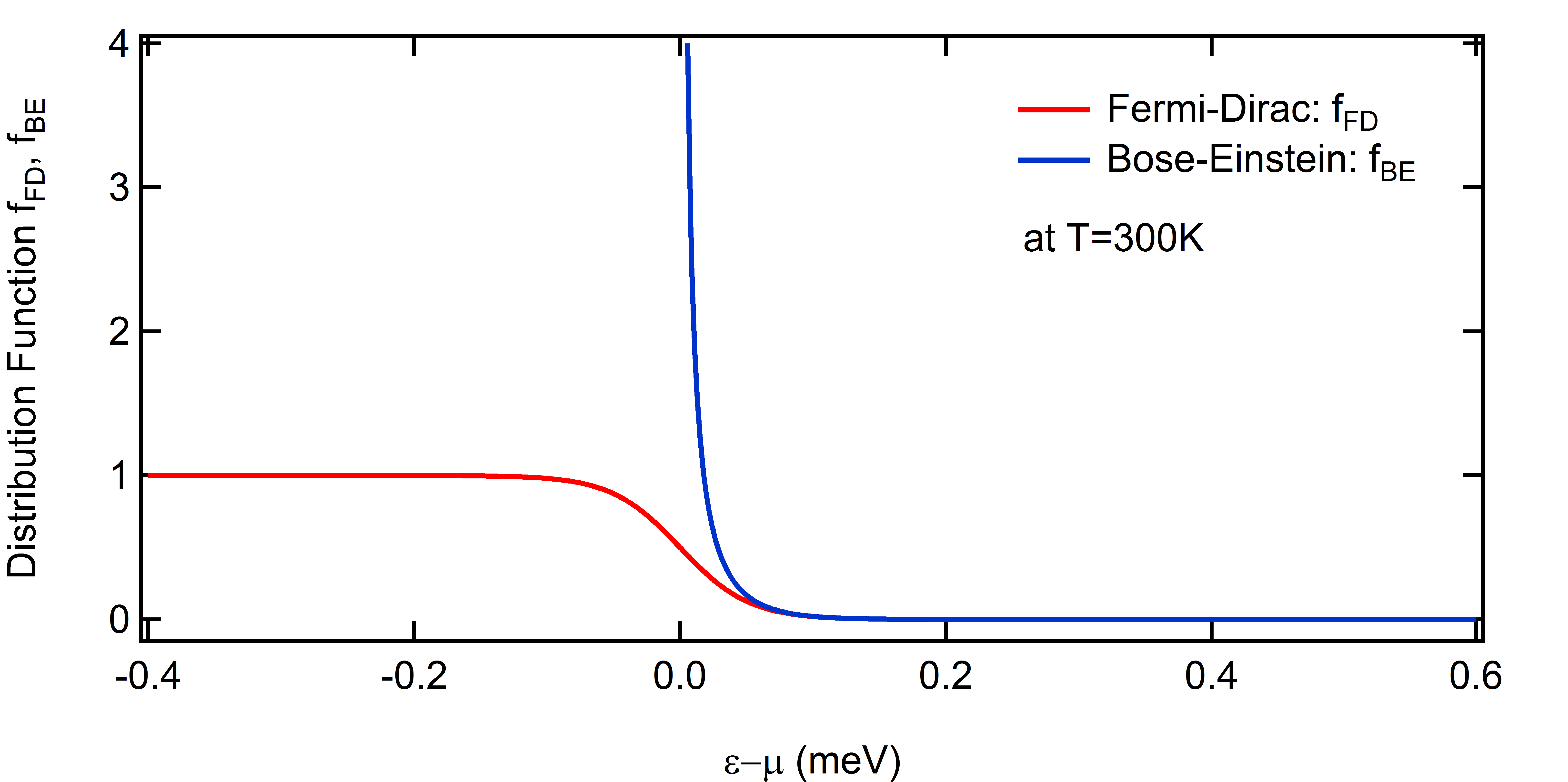 と呼ばれる分布になる。もし粒子が区別できてしまう場合には、このような分布を与えることは無い。具体的にどのような分布かというと、