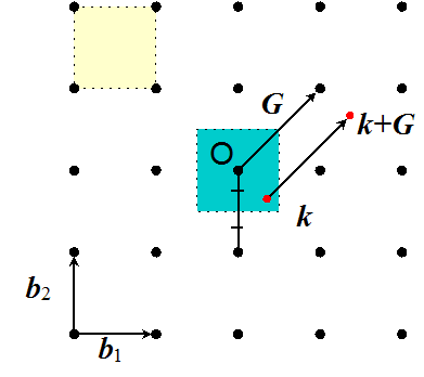 ということは、周期ポテンシャル中の一つの電子については、\(\b{k}\)空間の全領域を考える必要は全く無いということになる。だって、ある\(\b{k}_0\)という固有値を持つ状態がどんな状態なのかわかれば、任意の逆格子ベクトル\(\b{G}\)を\(\b{k}_0\)に足した\(\b{k}_1=\b{k}_0+\b{G}\)という固有値に対応する状態がどんな状態なのかも、自動的に分かってしまうのだから。