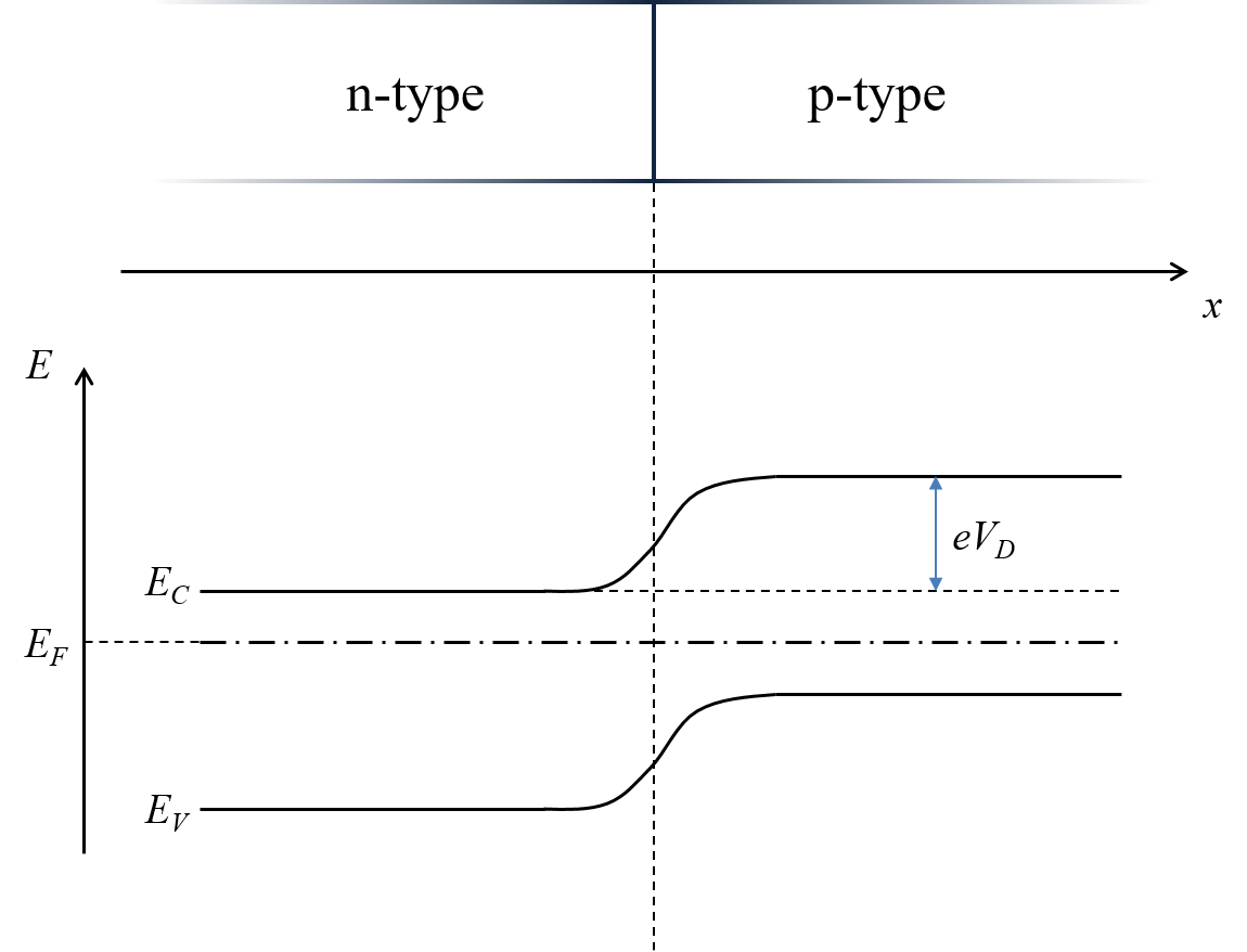 統計力学から、系が熱平衡状態となったとき、化学ポテンシャル (=フェルミエネルギー) はいたるところ一定になる。そこで pn 接合のバンド図を書くときには、まず双方のフェルミエネルギーが一致するようにp型・n型のバンド図を並べて書き、伝導帯底・価電子帯頂上のエネルギー\(E_C, E_V\)をなめらかにつないでやれば良い。ちょうど下の図のような感じになる。