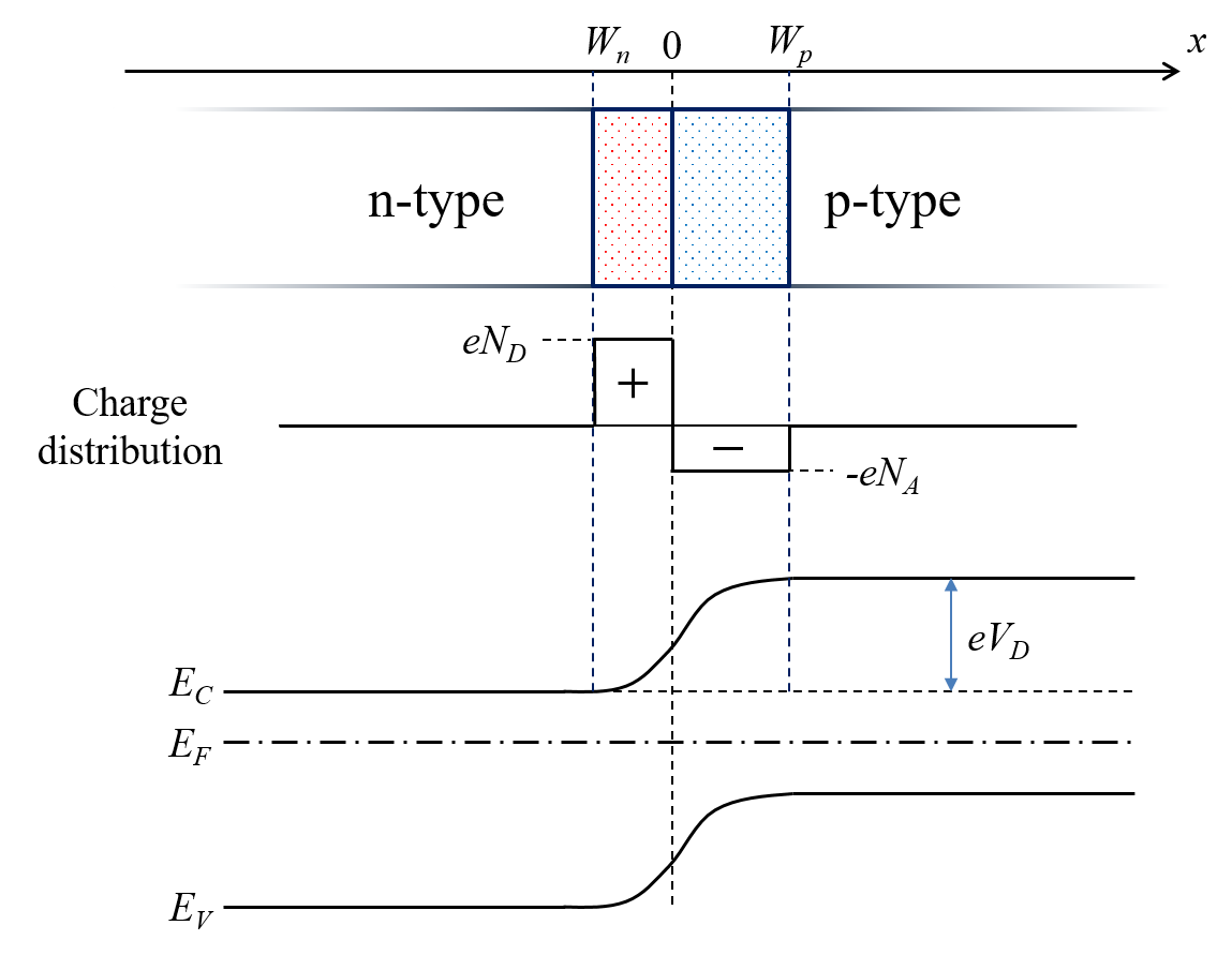 と呼ぶ。この仮定は物理的直感にも反さないだろう。p型領域には正孔がたくさん存在していて、逆にn型領域には電子がたくさん存在していることから、接合部では互いに消滅してしまうと考えられる。