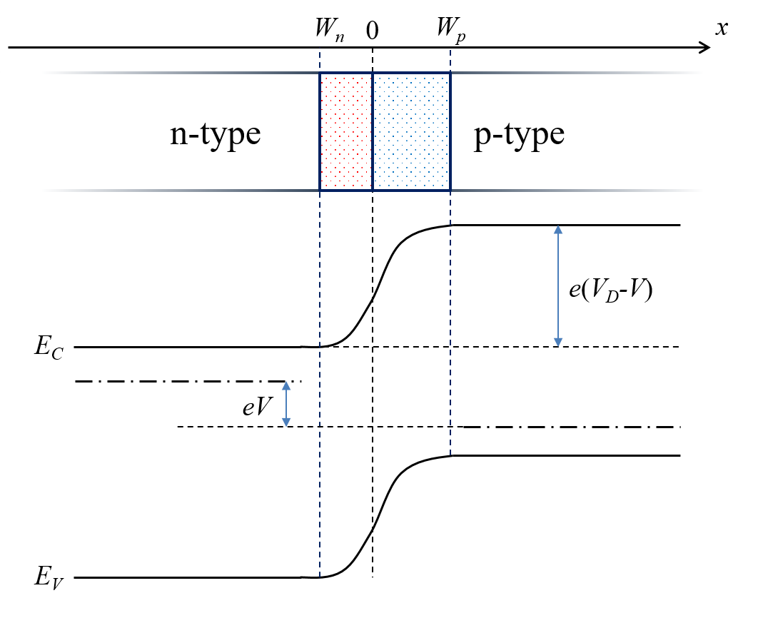 直流のバイアス電圧 \(V\) をかけたときには、もはや系は熱平衡状態にあるとはいえない。バンド図は拡散電位 \(V_D\) に加えて、バイアス電圧 \(V\) の分だけエネルギーバンド \(E_C, E_V\) がずれたような形となり、以下のようになる。\(V\) は順方向バイアス (エネルギー障壁が小さくなる方向) を正としている。
