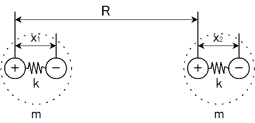 図のように、ある希ガス原子の電荷が少しだけ偏って存在していて、原子内の電荷はバネのような復元力でもって繋がれているとする。本当は電荷が連続的に分布しているようになっているはずだが、簡単のために点電荷\(\pm q\)があることにしよう。実際には原子内の電荷同士はバネなんかではなく、電気力で引き合ってその大きさを維持しているのだが、今回はめんどくさいのでバネにその役目を任せてしまおうというところだ。(点電荷を使って原子内の電荷を議論しようとすると原子の大きさがゼロになってしまったりして色々と大変。)