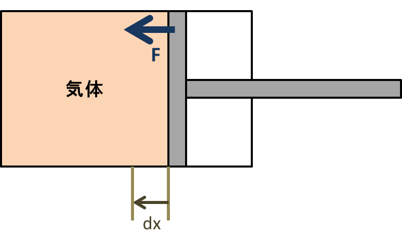 断面積はSで、ピストンをdx膨張方向に動かすことを考えれば、このときに気体に対して成される仕事は、