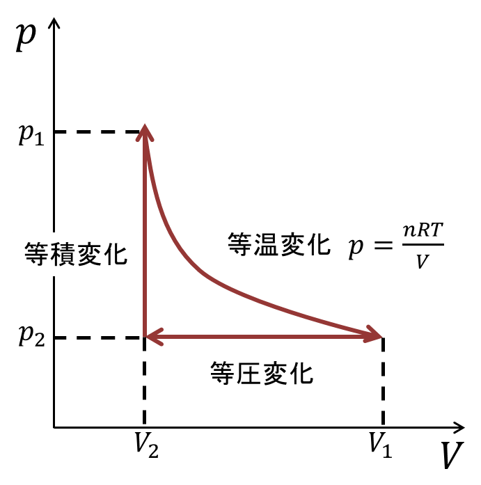さらにこの変化で熱はどのくらい出入りしているかということについて考えたい。ここでよく考えてみると、気体の